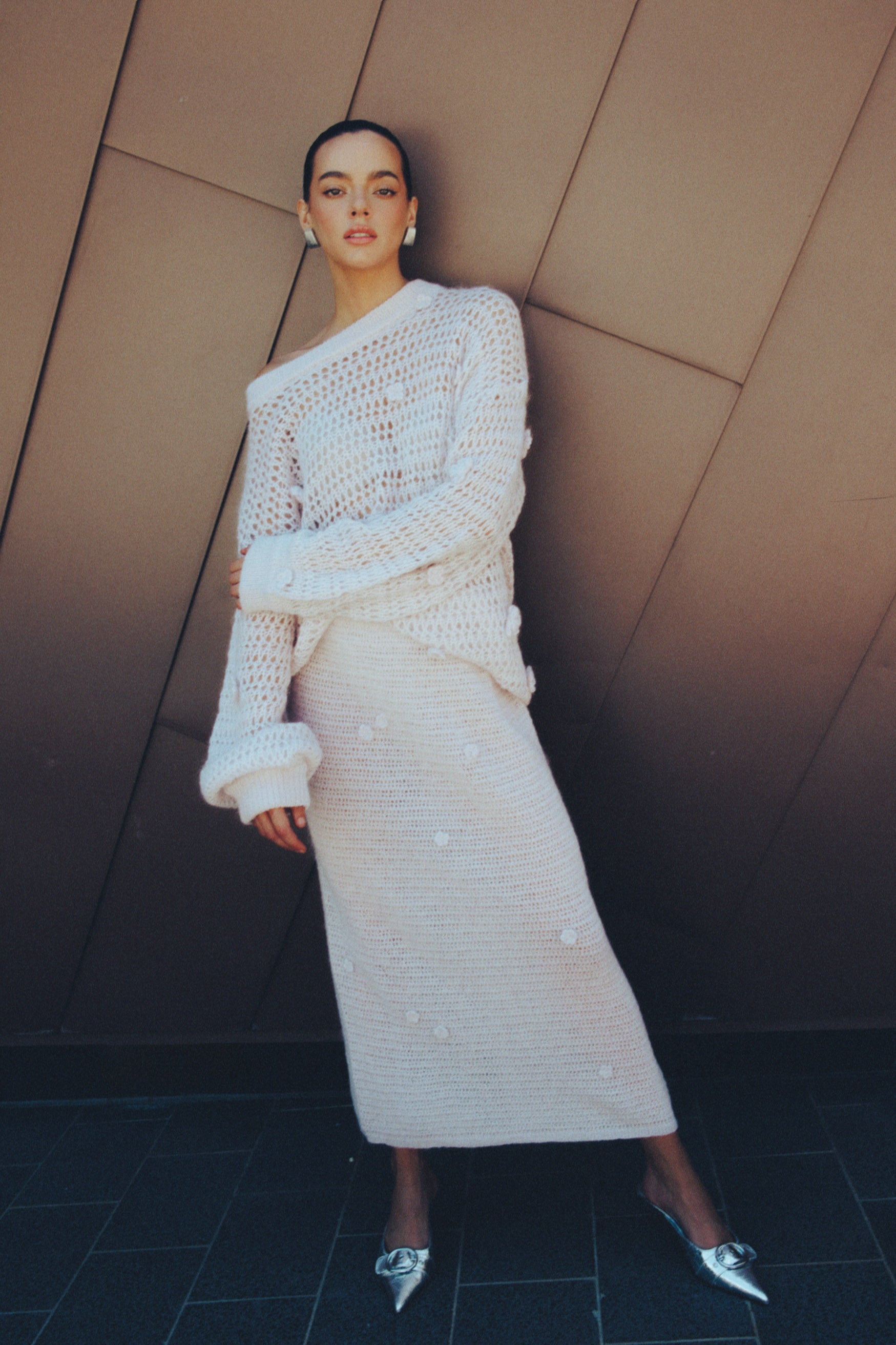 The Georgia Rosebud Knit Skirt is your must-have autumn essential, blending cozy knit fabric with delicate rosebud detailing for a touch of effortless elegance. Designed in a relaxed midi length with a back vent for easy movement and crafted from a soft mohair and wool blend, this versatile skirt pairs beautifully with the matching Georgia Rosebud Knit Jumper, the Lilac Gigi Sheer Feather Blouse, or your favourite tee.