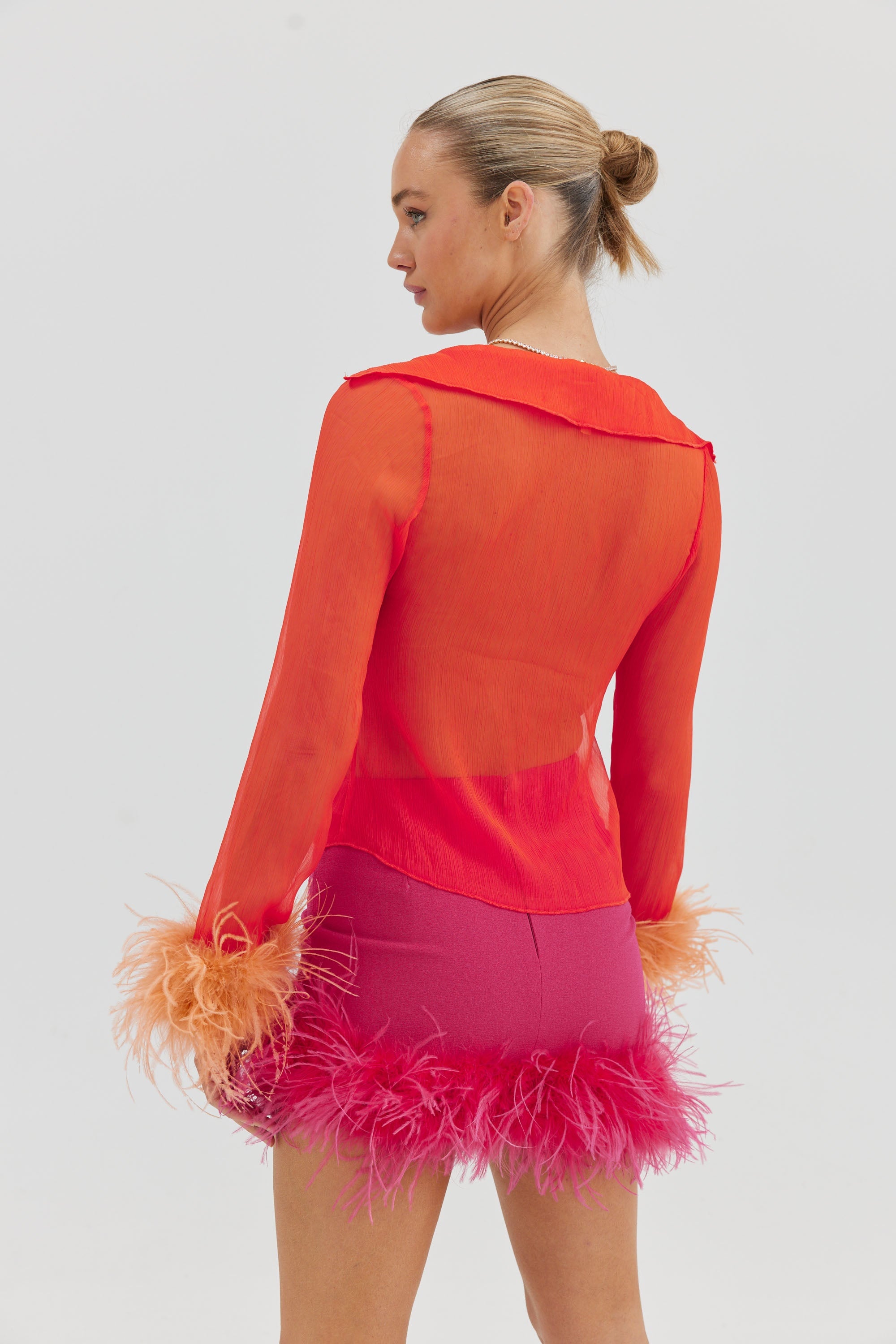 The party skirt you need this event season! Designed to be fitted at the waist, this mini is finished with an asymmetrical hem and Ostrich Feather trimming. Style with our Perla Sheer Blouse for the perfect party look.