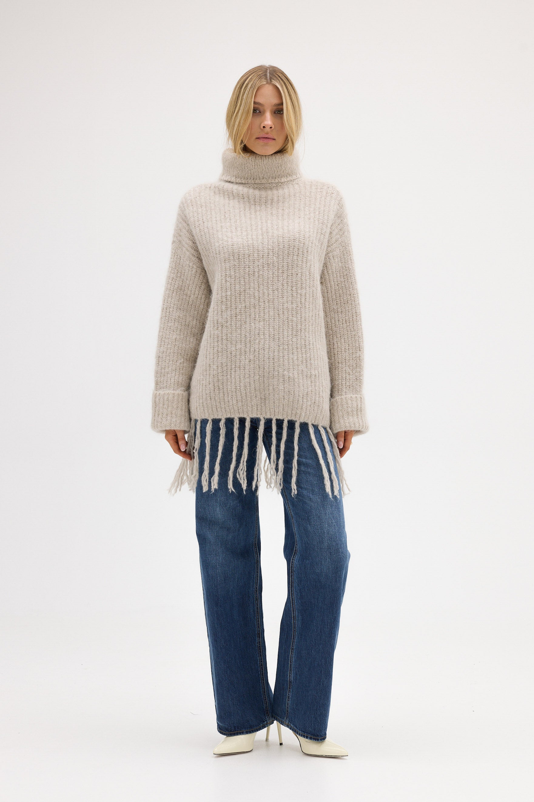 Introducing the Hannah Knit in Grey—your new cosy go-to. Made from a soft wool blend, this oversized turtleneck is all about effortless warmth with a little something extra. With its ribbed texture, rolled cuffs, and tassel hemline, it’s an instant outfit upgrade—whether you throw it on with denim or layer it over a slip dress.