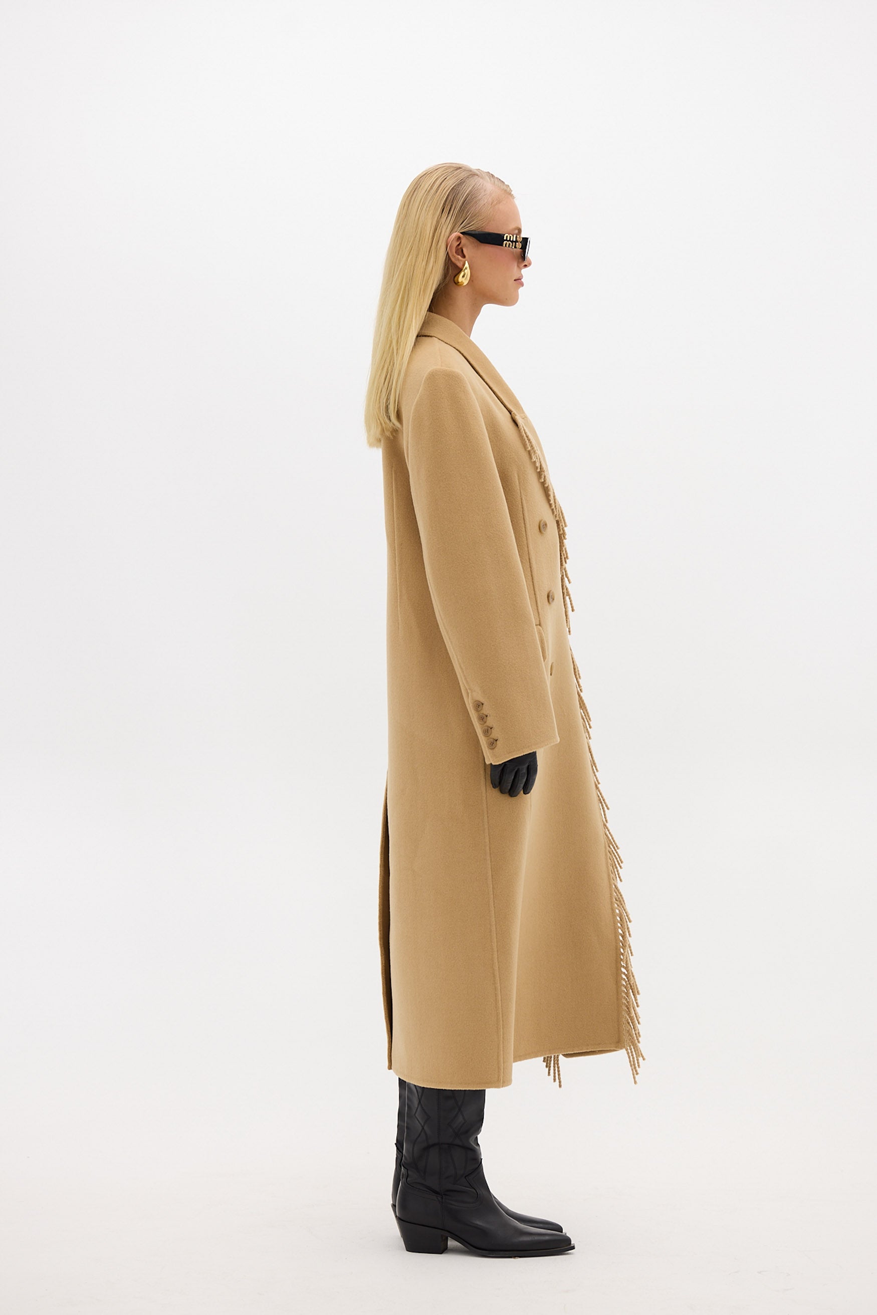 Say hello to your Winter staple. Made from 100% wool this beautiful double-breasted coat has a structured and oversized silhouette with asymmetrical fringe detail that runs along the lapel edge and down the front, adding texture and movement to the classic design. The Kate Coat will forever be a special piece in your wardrobe. Model is 173cm tall and wears a size S.