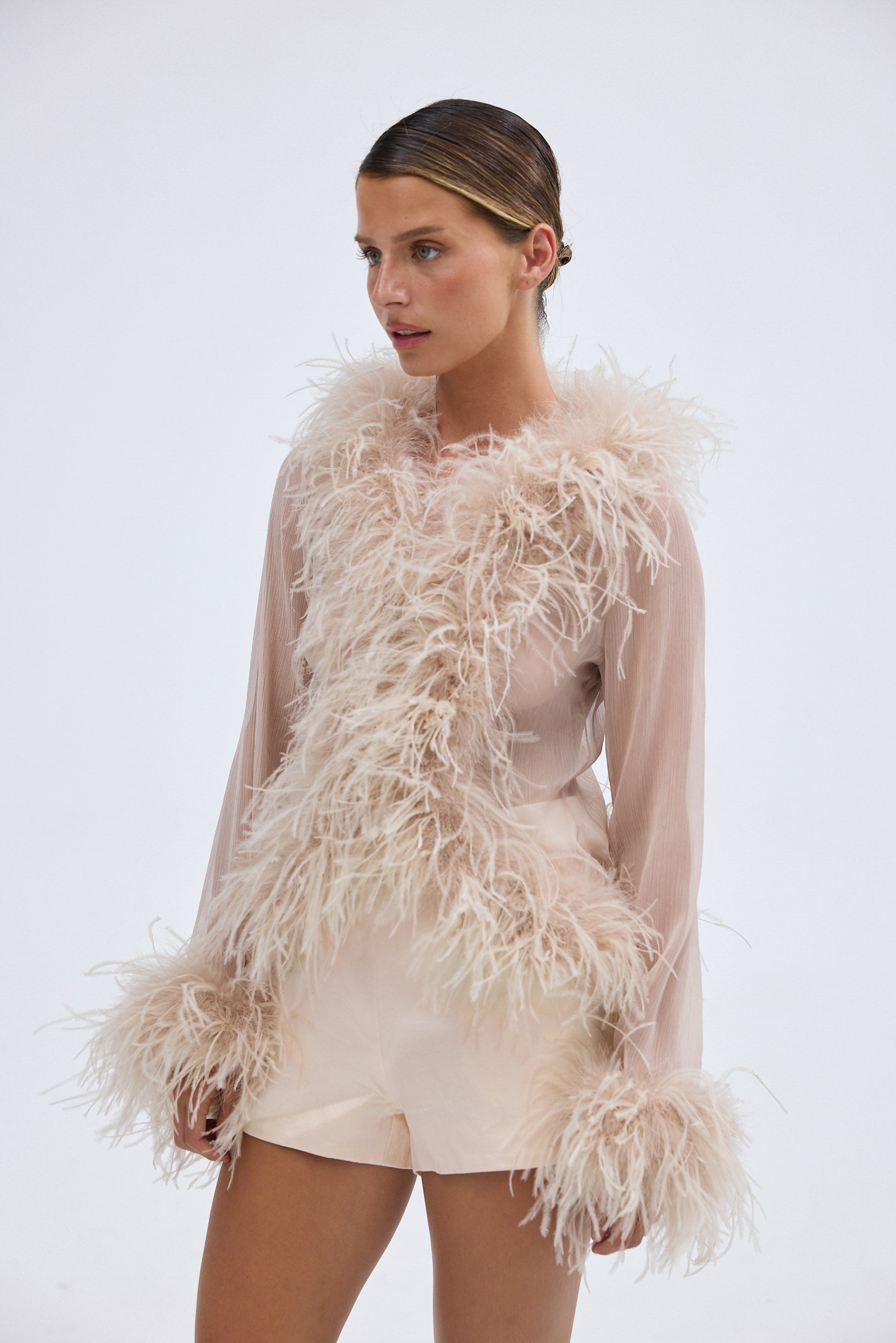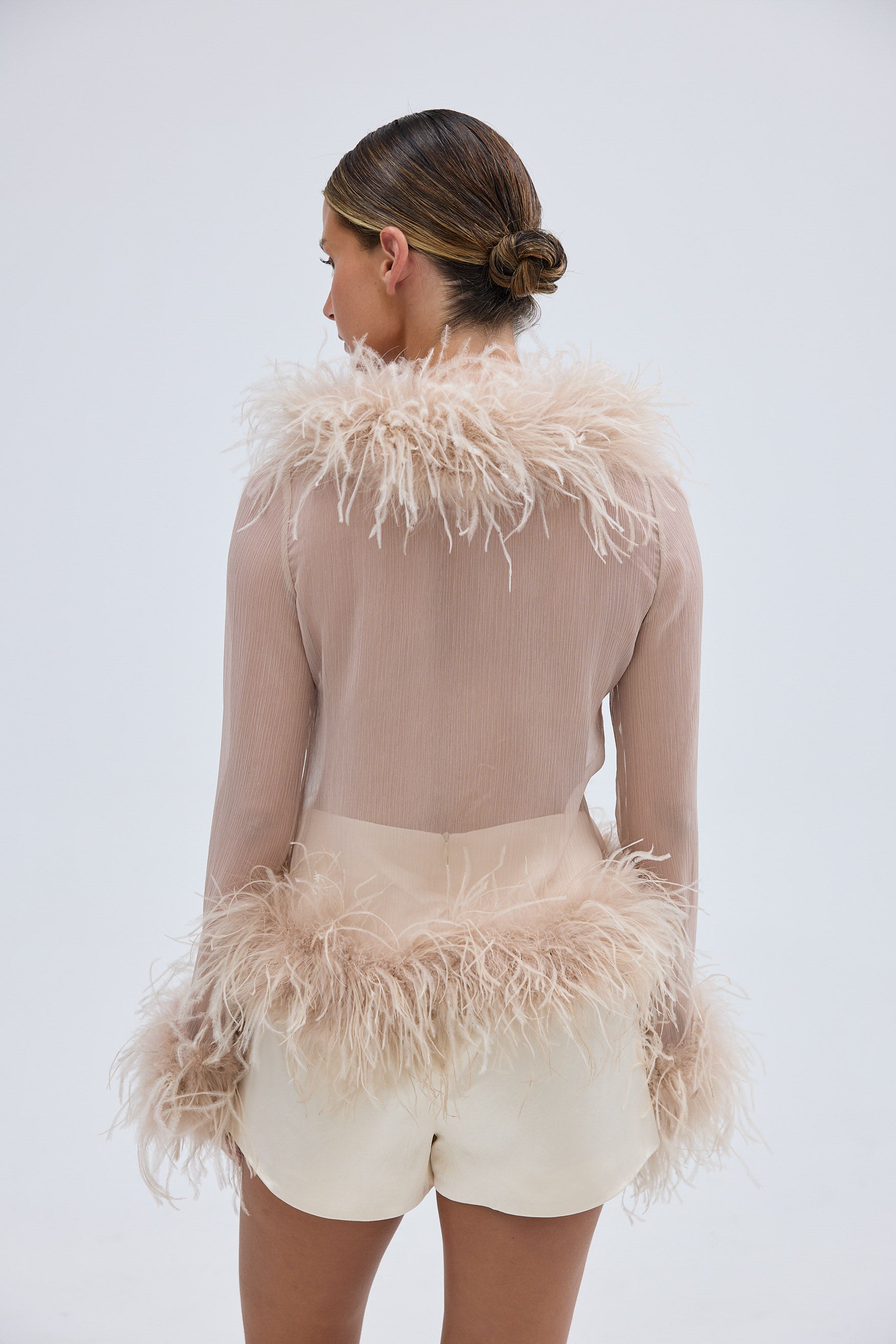 The Gigi Sheer Feather Blouse is a curated addition to your transeasonal wardrobe. Designed in a relaxed silhouette, the sheer blouse features Ostrich Feather trimming making it your go-to top for this party season. Style with our Penelope Bow Hot Short for your next event or pair back with your favourite denim.