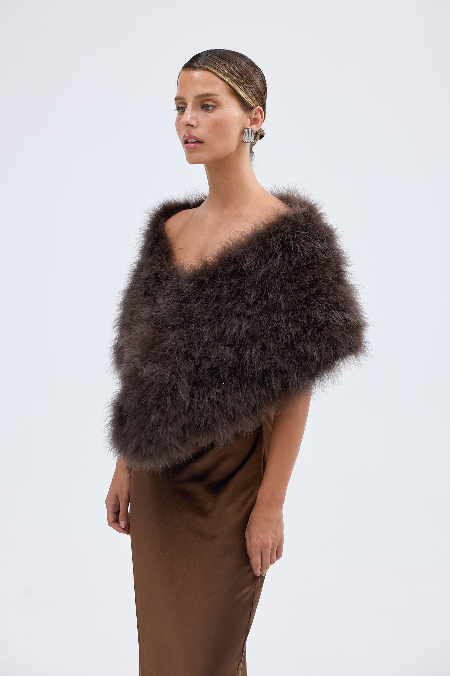 The Lottie Wrap is the perfect accessory for lavish events. This chic wrap is composed of up-cycled Marabou Feather and sits elegantly over the shoulders with a fastening at the front for closure.